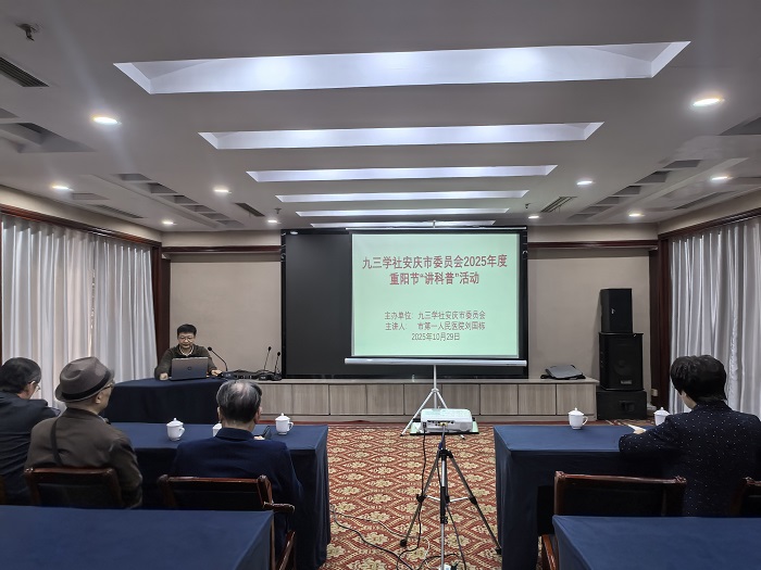 10月29日,九三学社安庆市委员会开展2025年度重阳节健康养生科普讲座活动,活动邀请九三学社安庆市医药二支社主委、市第一人民医院老年医学科主任刘国栋授课。市政协副主席、九三学社安庆市委员会主委程玉梅出席活动,专职副主委吴学勤主持。