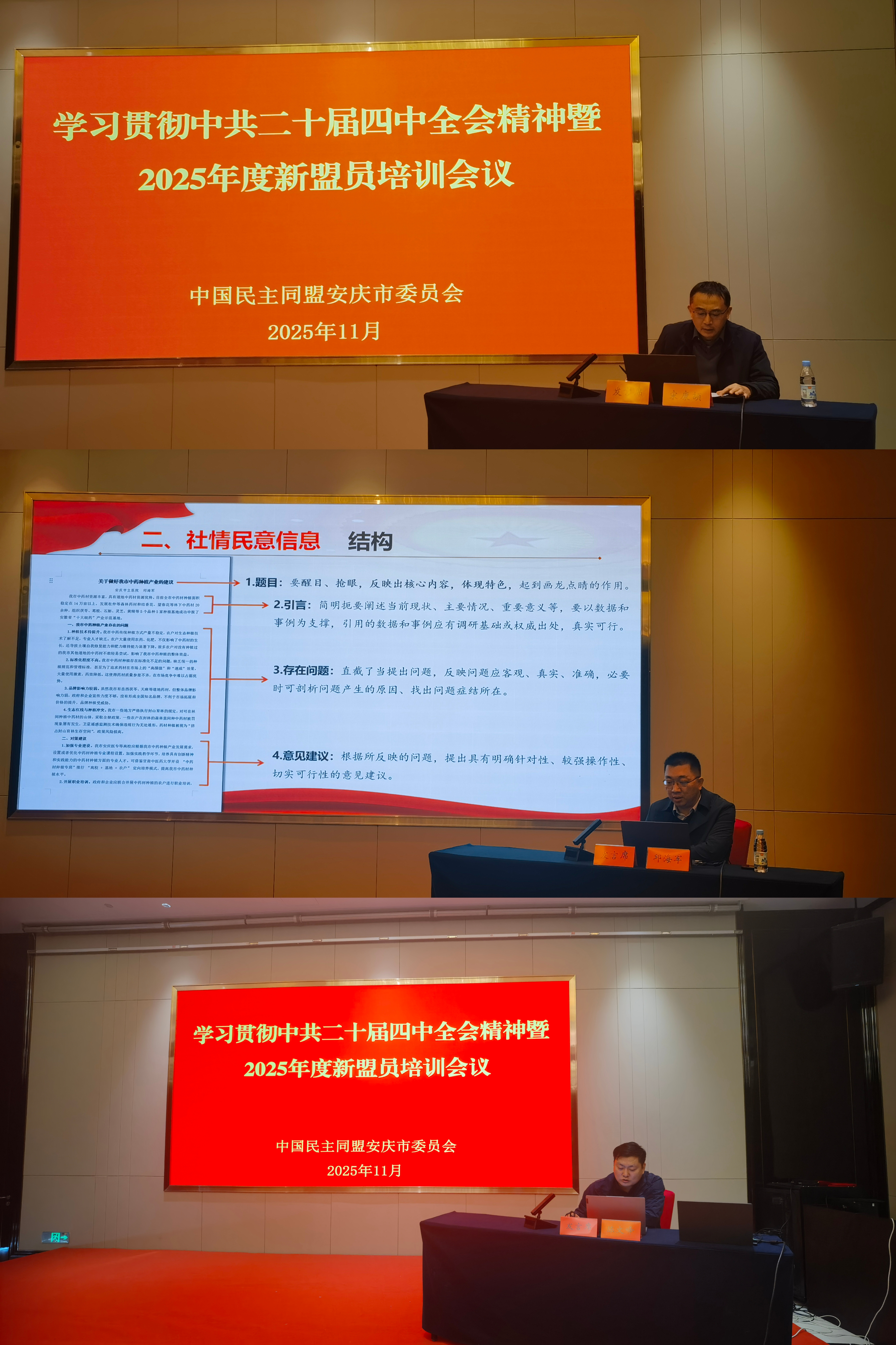 11月30日上午,民盟安庆市委会召开学习贯彻中共二十届四中全会精神暨2025年度新盟员培训会议。民盟安庆市委会主委、安庆医药高等专科学校副校长毛以成主持会议,副主委李佳莹、杨洋、郑玉兰出席会议,老盟员代表、2025年新发展盟员及机关干部职工参加会议。